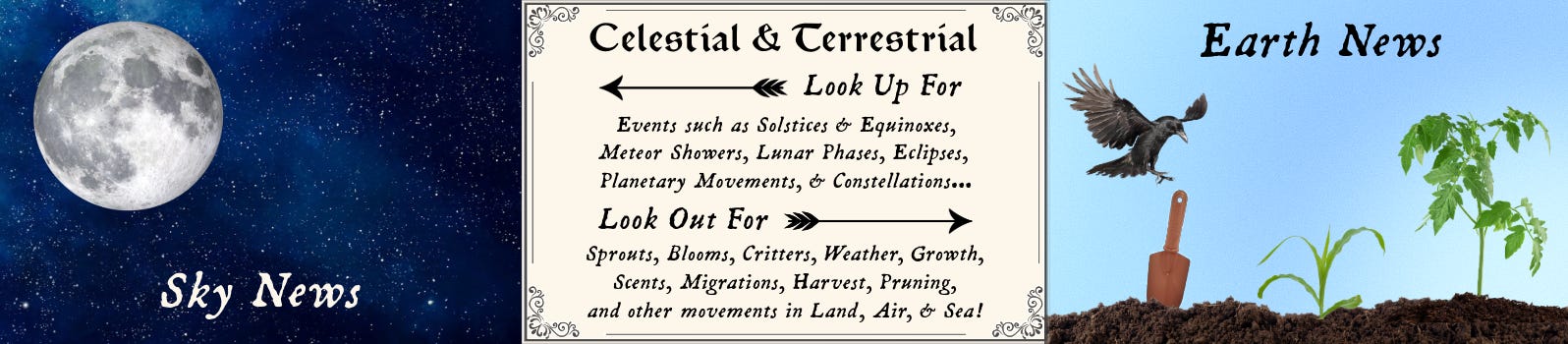 Seasonal awareness - A monthly highlight on what is twinkling overhead, sprouting underfoot, and otherwise expanding and contracting.